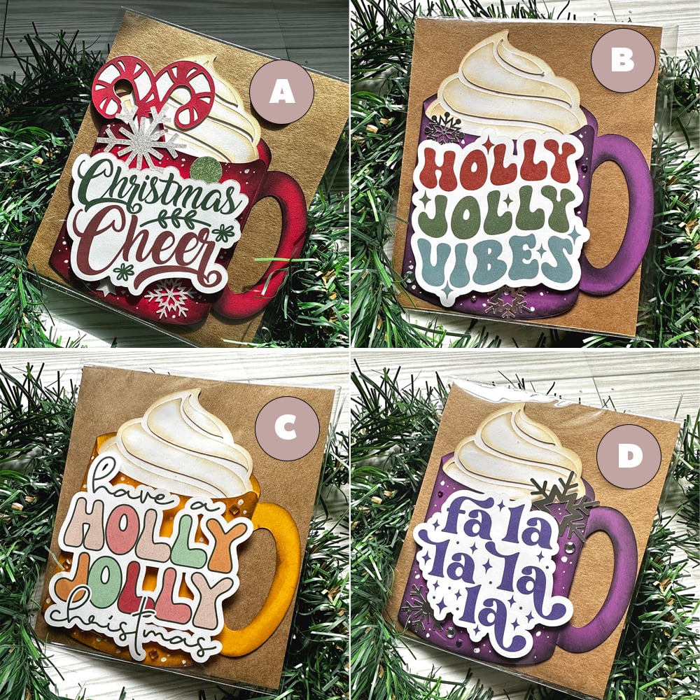 These make a great holder jazz up your gift cards for family, friends, teacher gifts, co-workers. Many colors and designs to choose from. Just slide your card into the opening inside the top. The back of the mug is blank so you can write your personalized message.